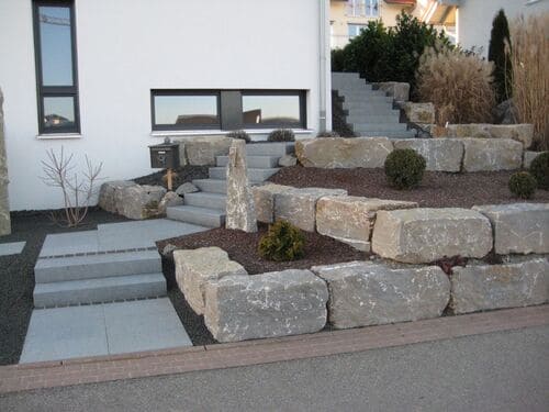 Entdecken Sie unser Naturstein Sortiment. Von massiven Mauersteinen, über elegante Blockstufen bis hinzu feinem, filigranen Ziersplit.